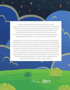 Biel e a estrela platônica é um conto de autoficção infantil, com pano de fundo filosófico, que pretende, por meio da fantasia e da leveza do universo lúdico infantil. Apresenta-se como uma estratégia familiar para a construção de memórias e valores, envolvendo o apego saudável às emoções, como saudade, despedidas, amor ao belo filosófico, à natureza e ao respeito aos animais de estimação, que tanto auxiliam na noção de amor e cuidado ao próximo em suas vulnerabilidades. É um conto que transporta e induz o leitor ou ouvinte a se imaginar como personagem da narrativa, sentindo e brincando junto a suas personagens. Adentre e faça do momento da leitura de sua criança um espaço de amor, cuidado, leveza e aprendizado.